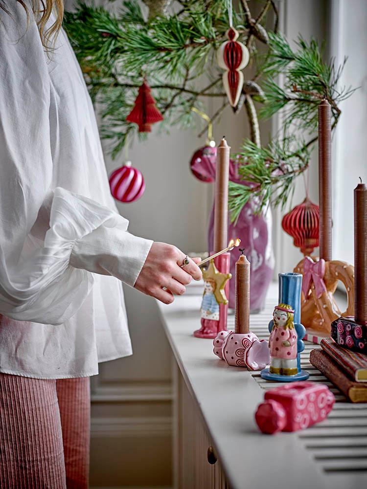 Skulpturelle lysestager og det bløde skær fra stearinlys skaber et roligt og indbydende lys, der tilfører varme og stemning i hjemmet gennem hele julen.