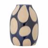 The Bashir Vase by Bloomingville is a stoneware vase with a distinctive sculptural silhouette, featuring a narrow top and bottom contrasted by a wider midsection. It is finished with a glossy blue waxed glaze and decorated with beige oval motifs. Small variations in pattern and colour intensity may occur, making each vase unique.